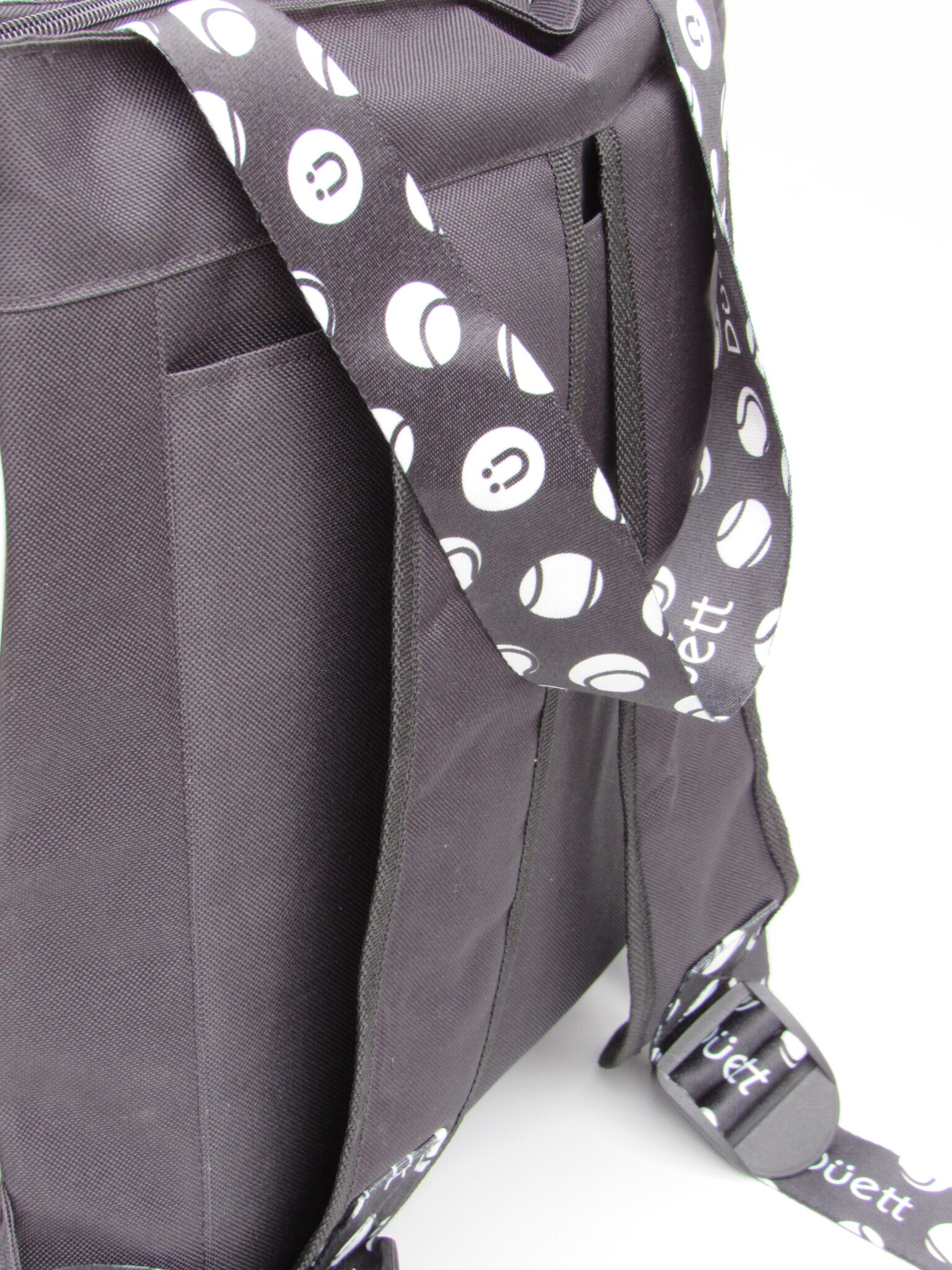 • Bolsillos laterales profundos con elástico para botella de agua y tubo de pelotas