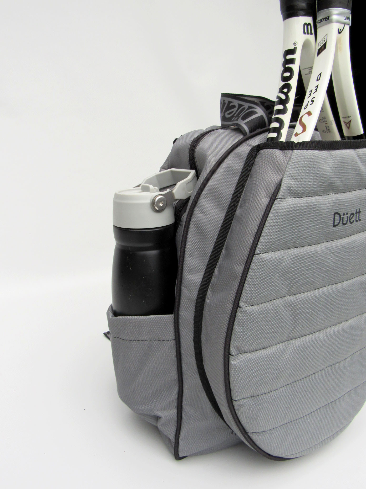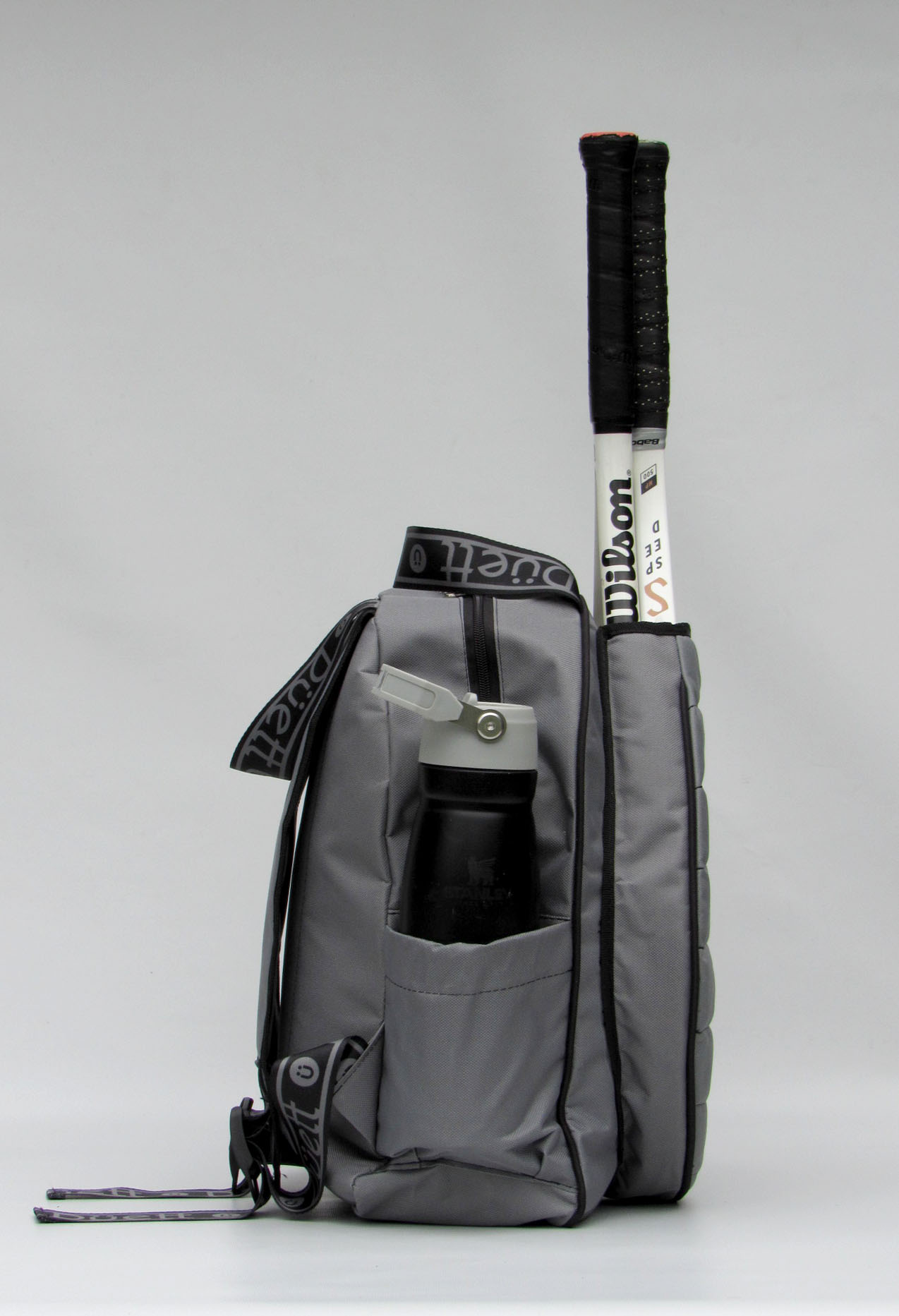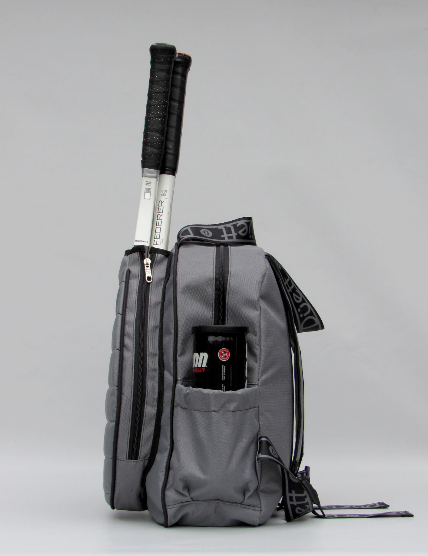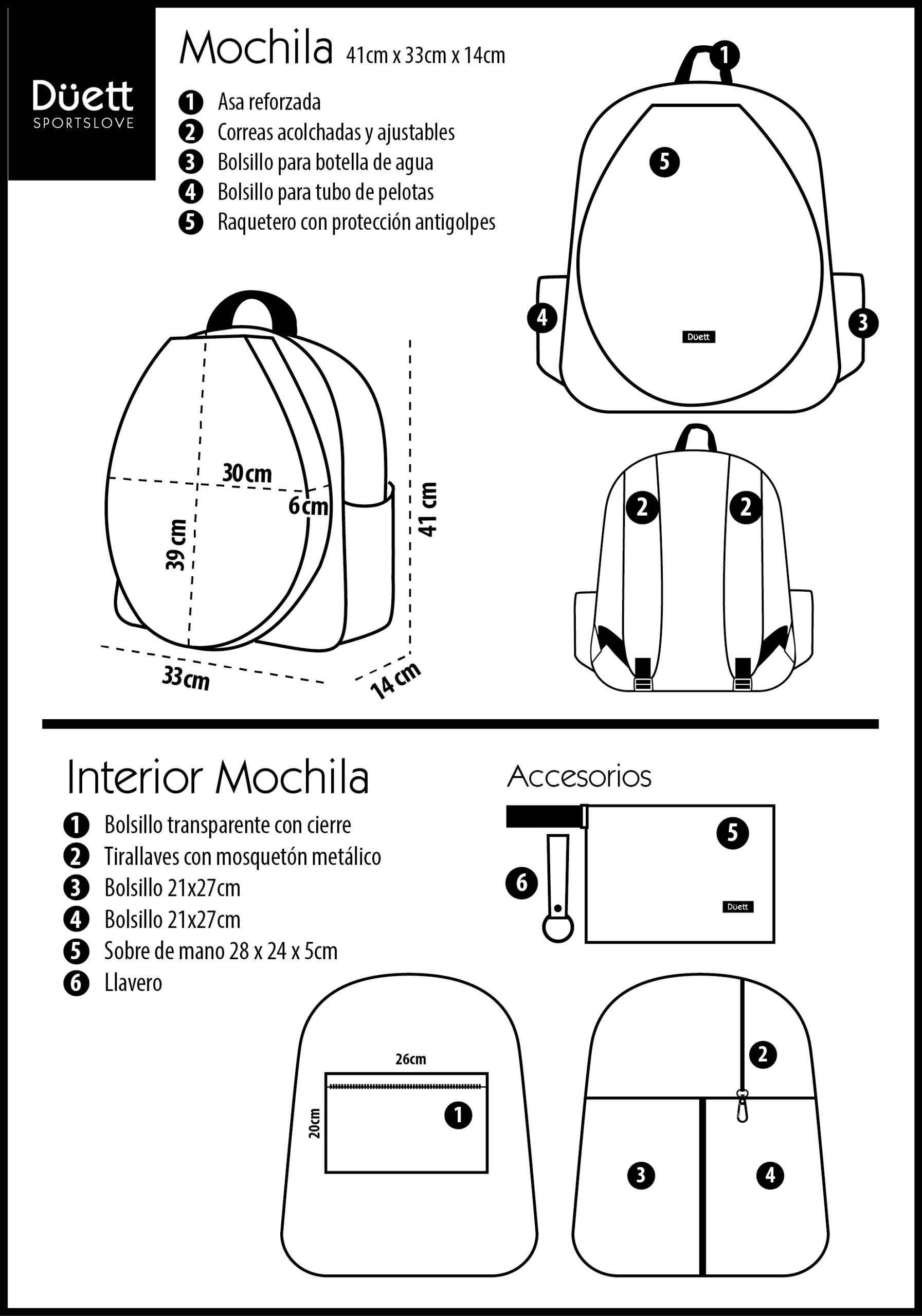 • Bolsillos laterales con profundidad y elástico para botella de agua y tubo de pelotas.
