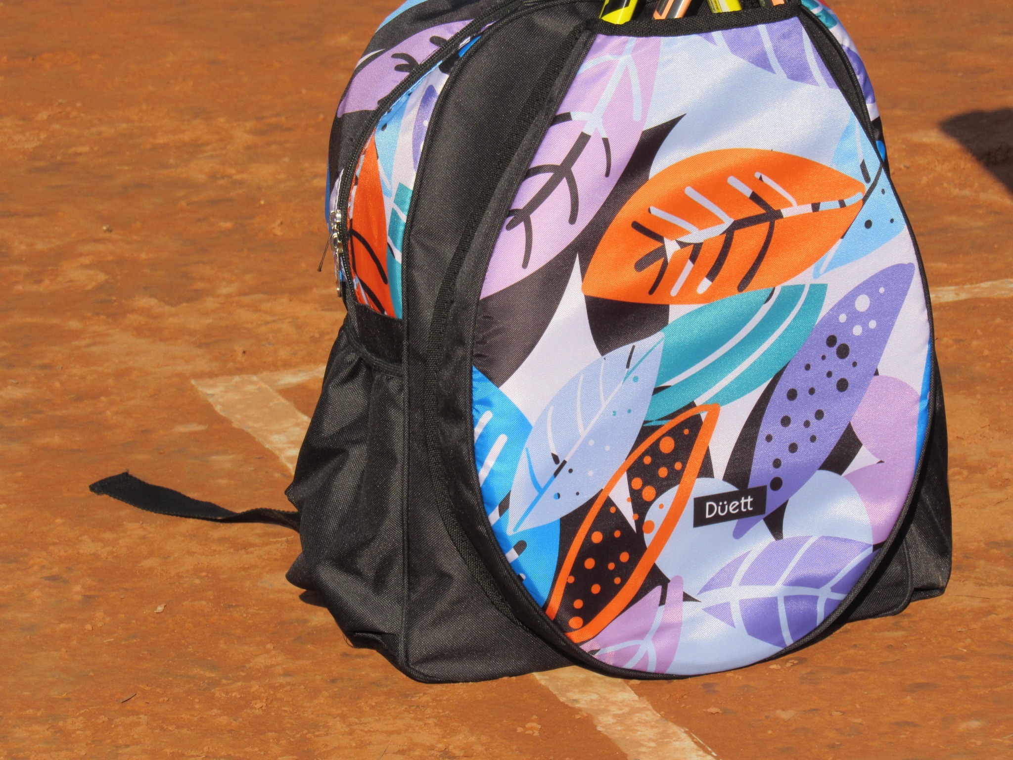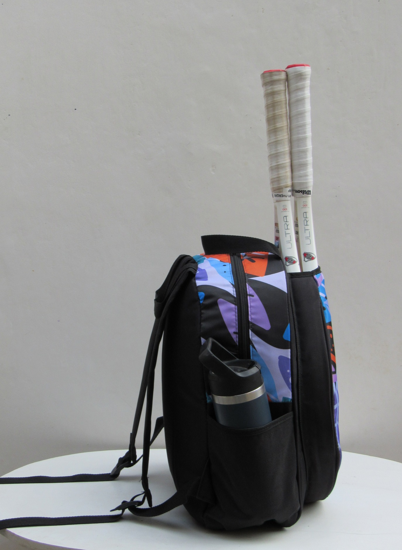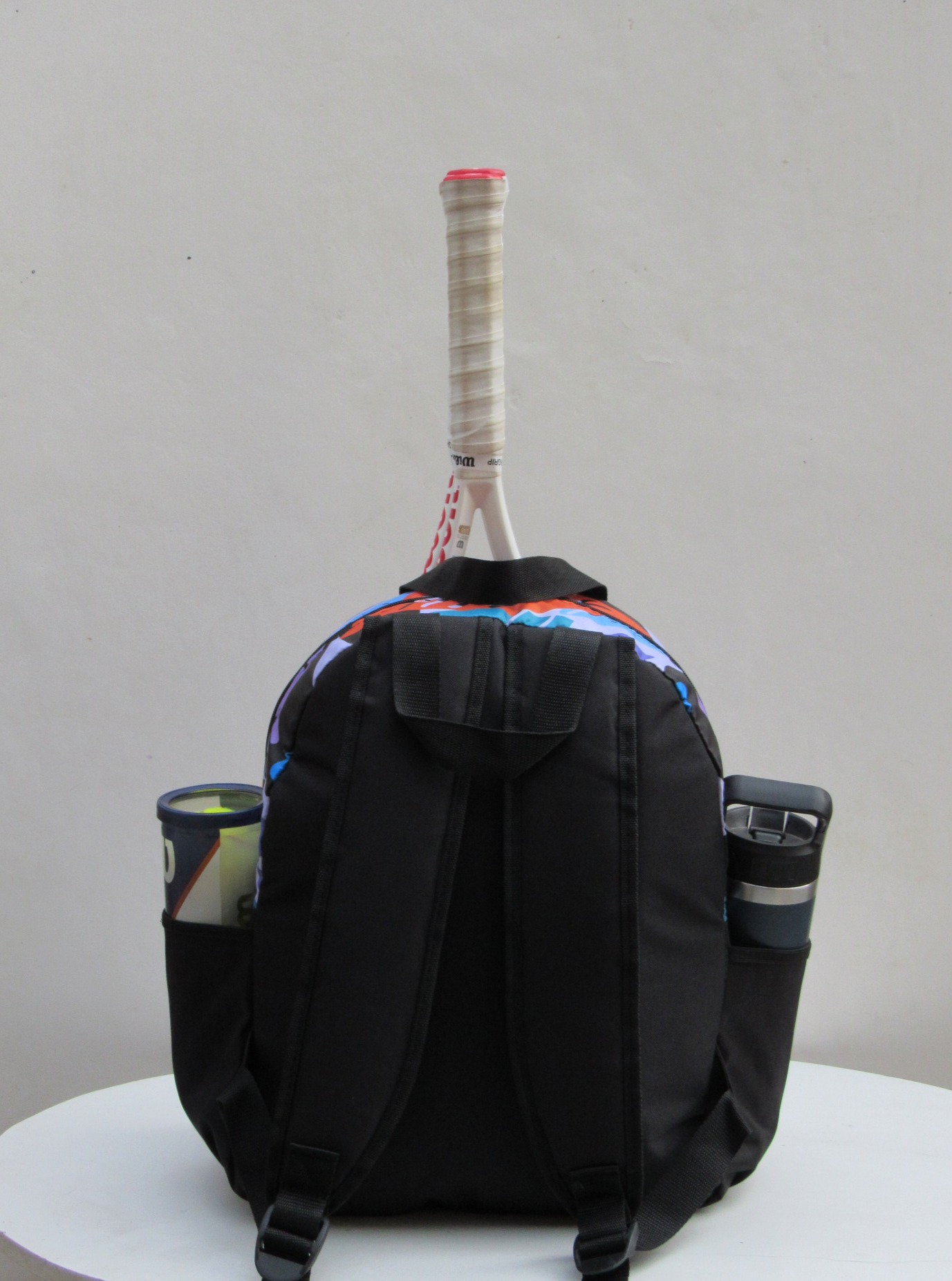 • Bolsillos laterales con profundidad y elástico para botella de agua y tubo de pelotas.