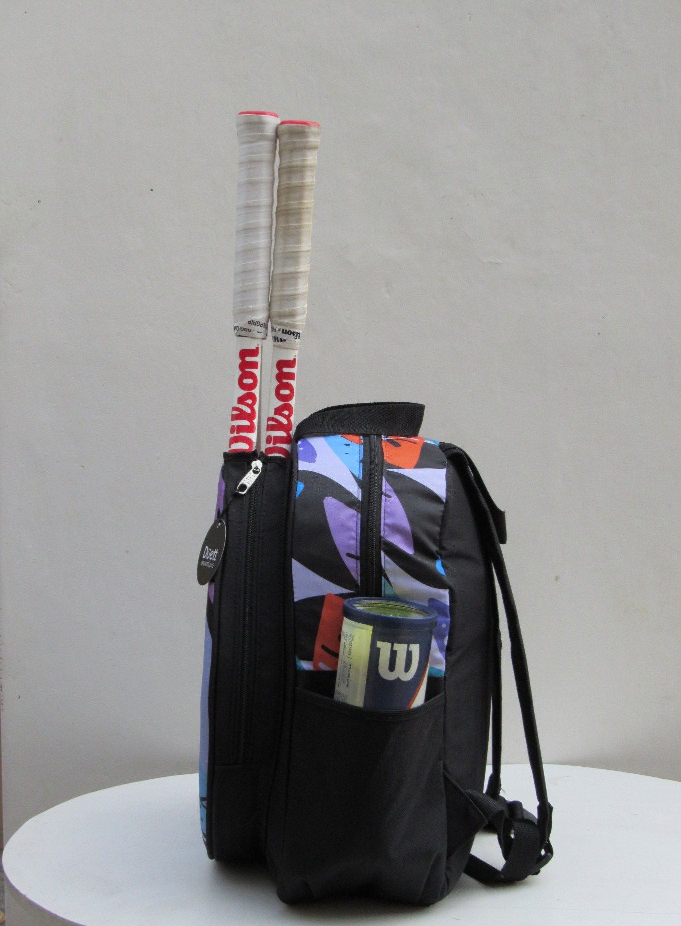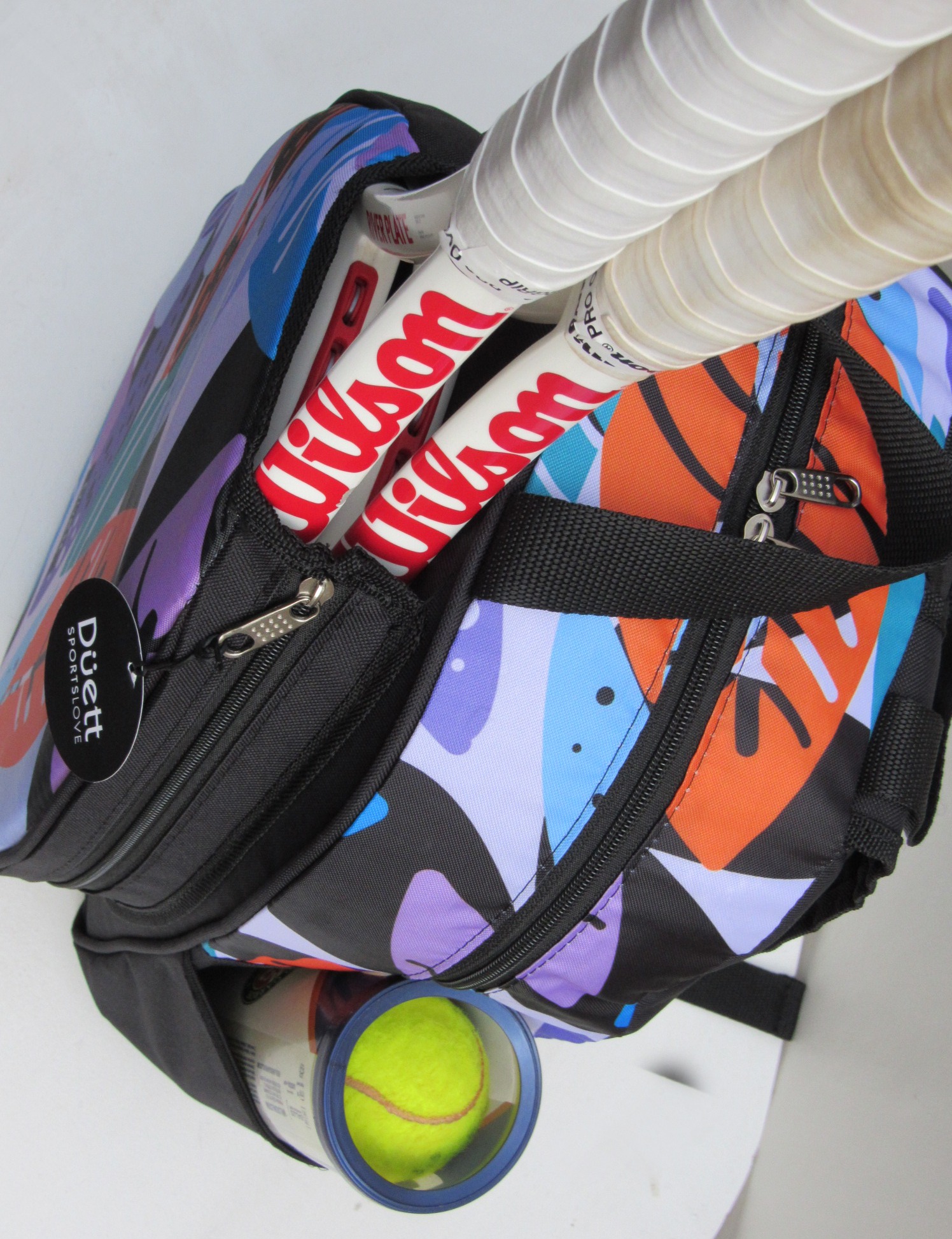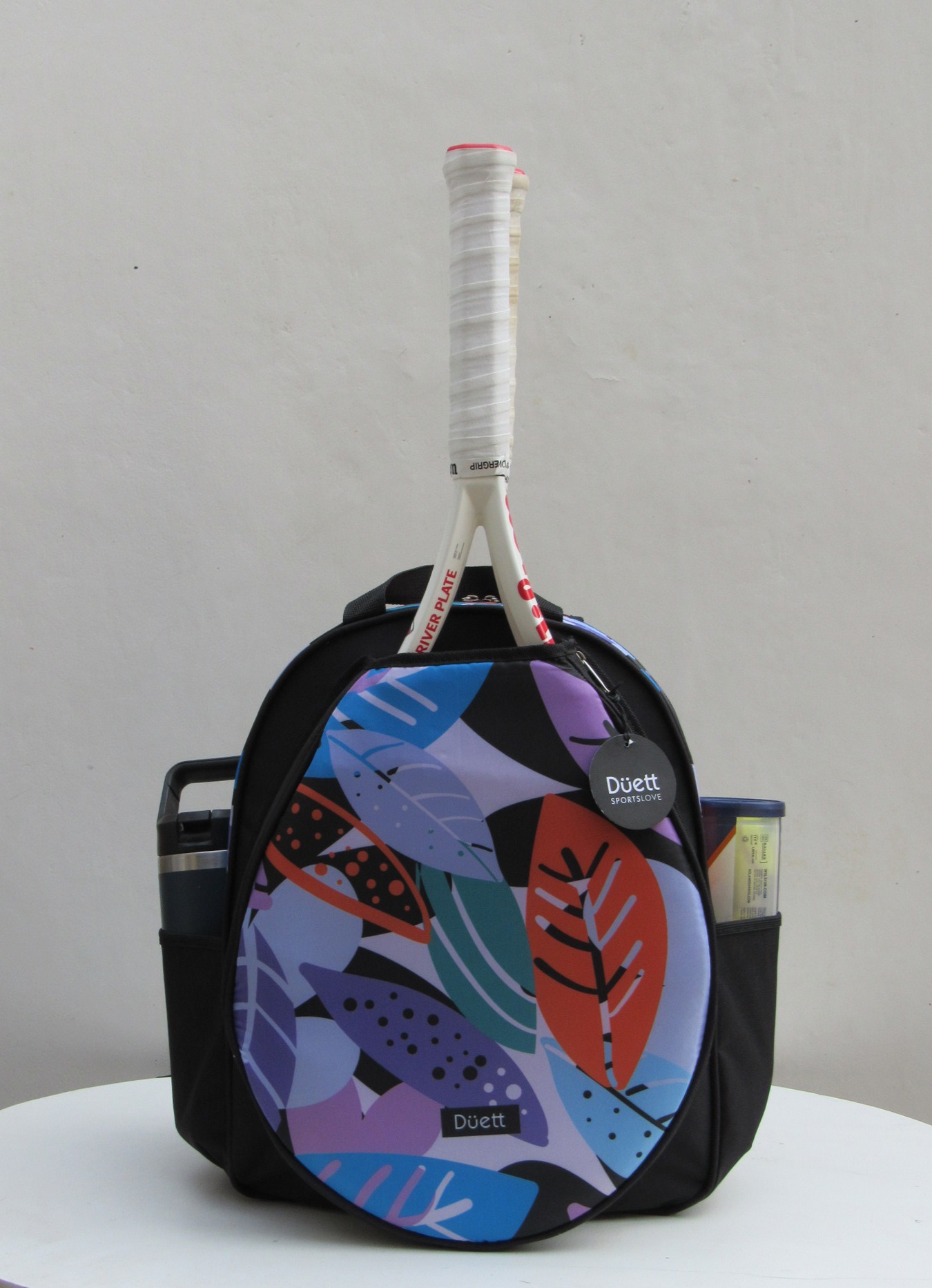 • Bolsillos laterales con profundidad y elástico para botella de agua y tubo de pelotas.