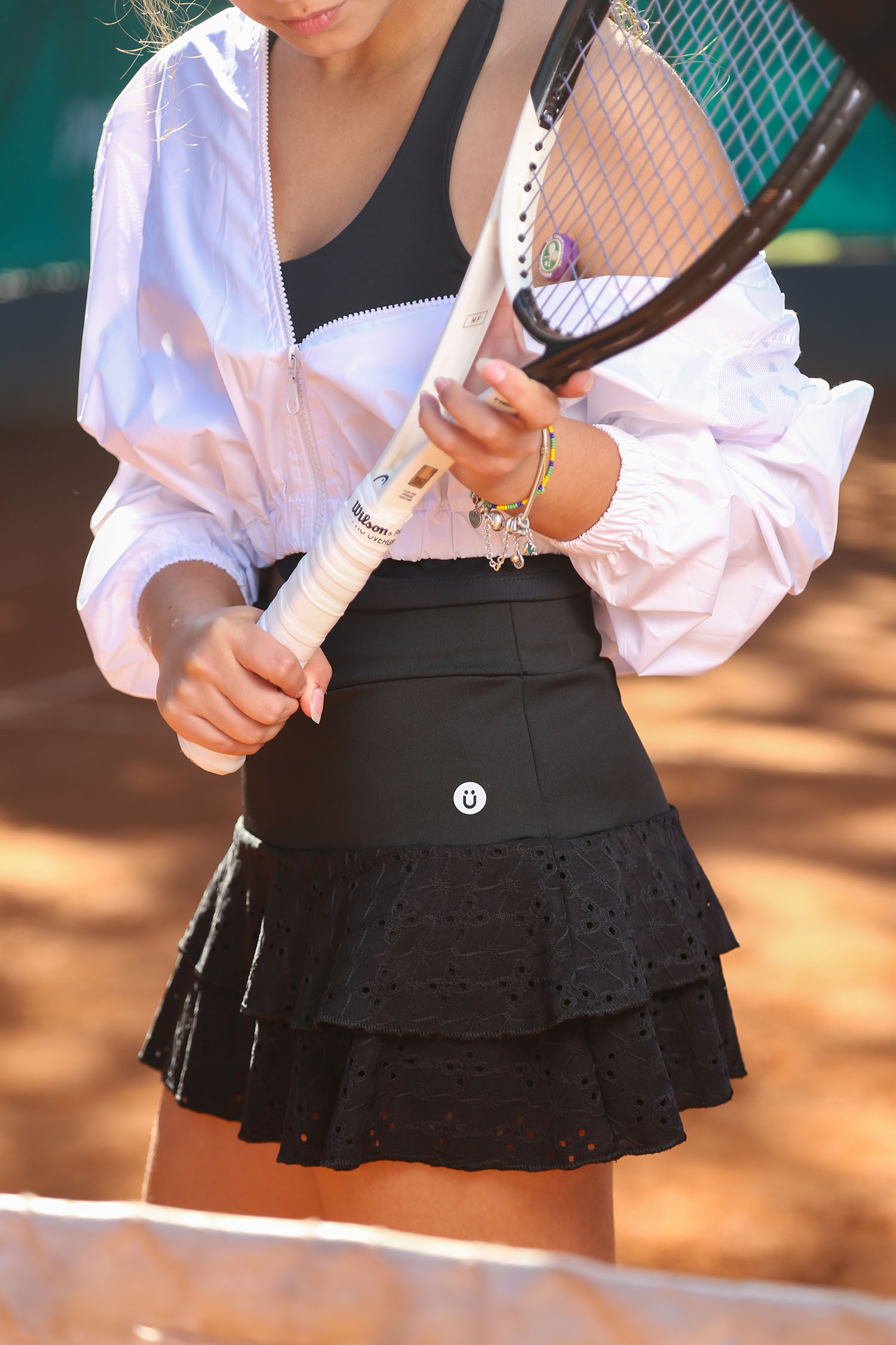 Pollera de lycra con volado en broderie elastizado. Con short de lycra a tono.